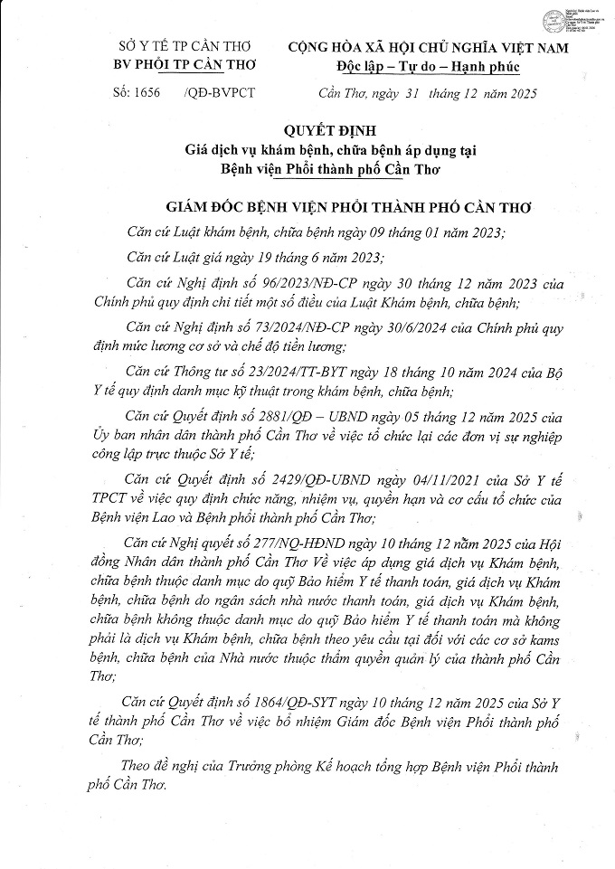 Bệnh viện Phổi TP. Cần Thơ trân trọng thông báo đến Quý người bệnh về việc điều chỉnh giá dịch vụ y tế theo Quyết định số 1656/QĐ-BVPCT ký ngày 31/12/2025.