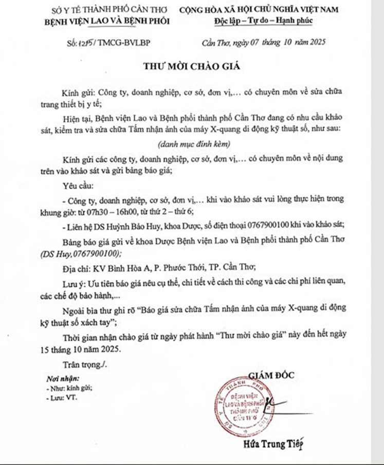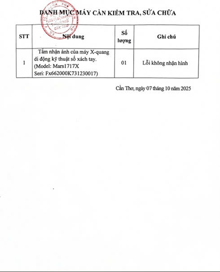 THÔNG BÁO BÁO GIÁ SỬA CHỮA TẤM NHẬN ẢNH PHIM XQUANG DI ĐỘNG KỸ THUẬT SỐ