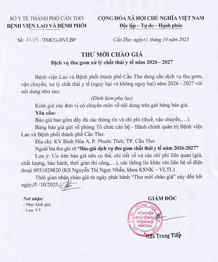 BÁO GIÁ THU GOM XỬ LÝ CHẤT THẢI Y TẾ NĂM 2026-2027