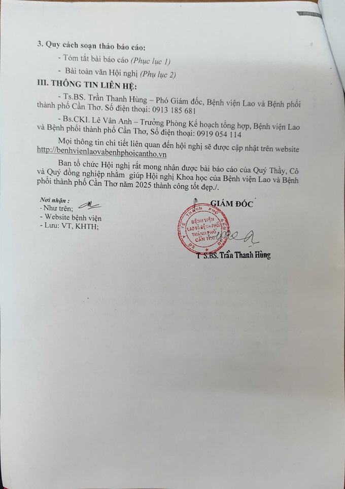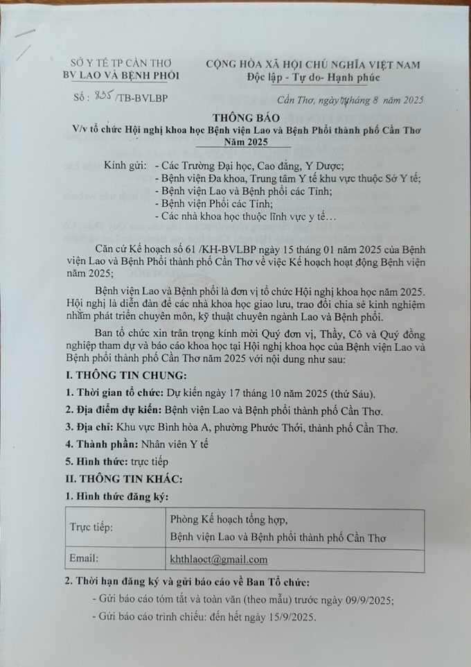 THÔNG BÁO HỘI NGHỊ KHOA HỌC 2025 Bệnh viện Lao và Bệnh Phổi TP. Cần Thơ dự kiến tổ chức Hội nghị Khoa học năm 2025 vào ngày 17/10/2025 (Thứ Sáu), tại trụ sở bệnh viện. Hội nghị là diễn đàn khoa học nhằm chia sẻ kinh nghiệm, cập nhật chuyên môn trong lĩnh vực Lao và Bệnh phổi.